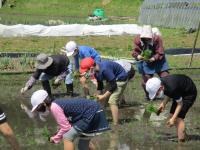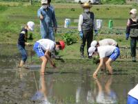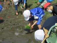 今年も、たかねをクラブの皆さんに教えていただきながら、4月25日に田植えをしました。最初に、3本ずつ植えることなどを丁寧に教えていただきました。1本に約80~100粒のお米が実ること、お米を作る人はその一粒一粒を大切に食べているということも教えていただきました。5年生も6年生も昨年に引き続き2回目ということもあり、昨年より上手に植えることができたようです。