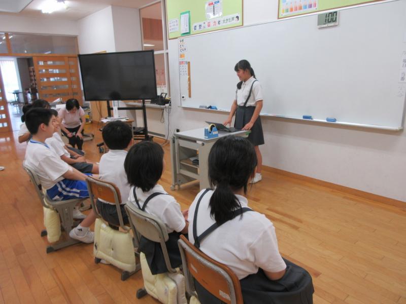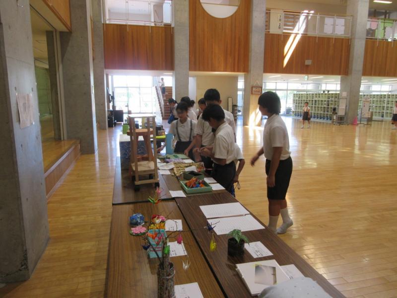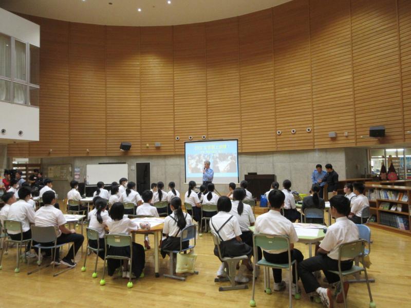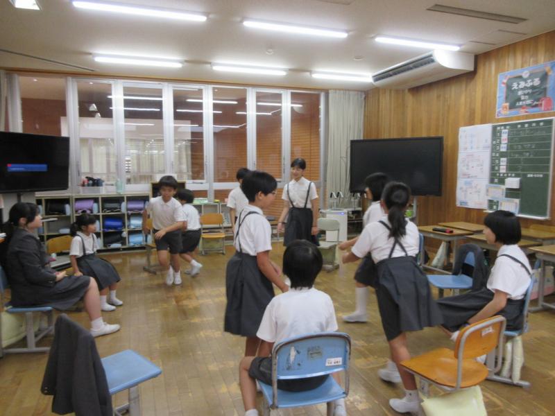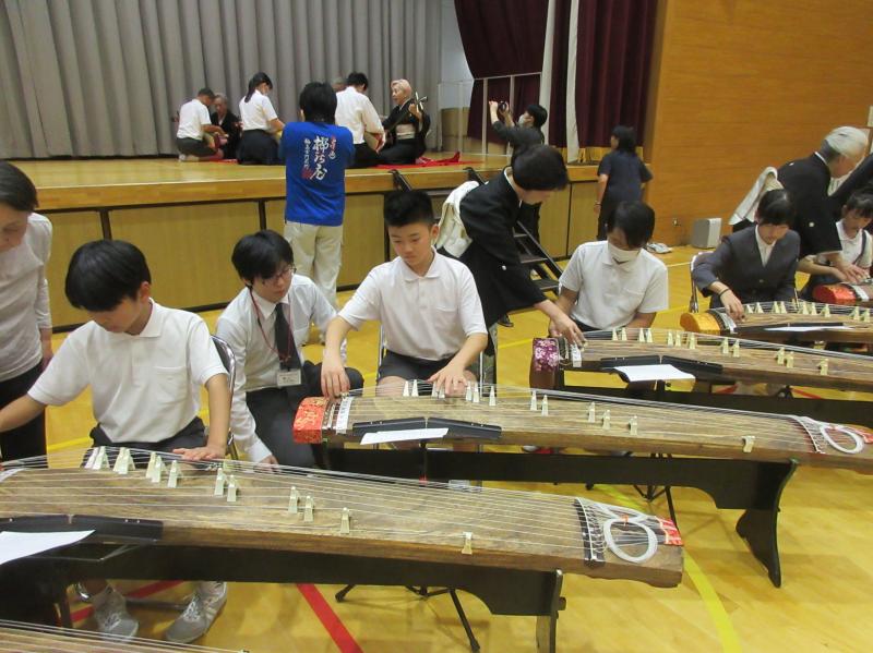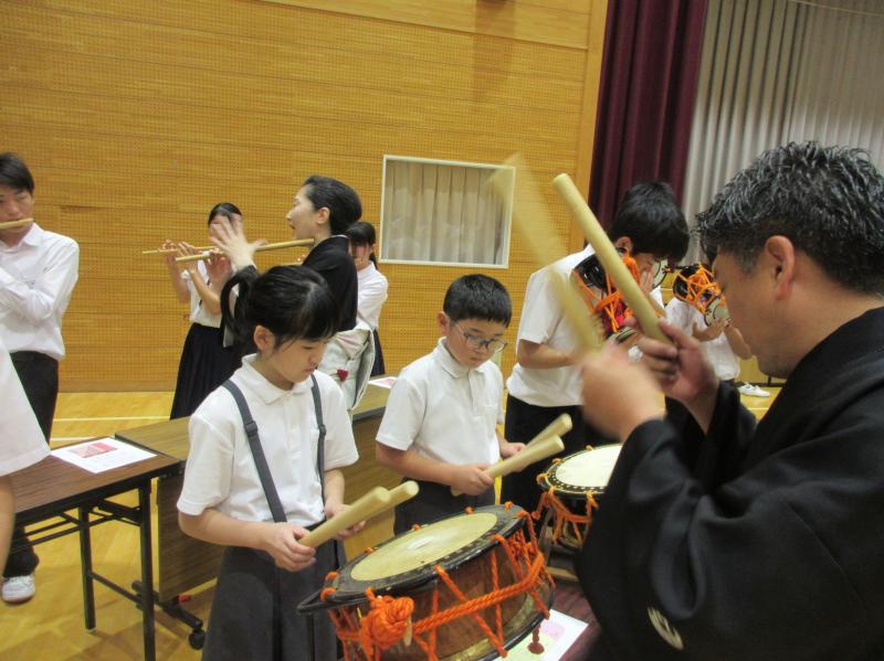 2025年10月10日 14時39分小中合同の古典芸能鑑賞教室がありました。日本舞踊を鑑賞したり、邦楽器の解説を聞いたりしました。箏、三味線、鼓、太鼓の和楽器や扇子を使った日本舞踊を体験させてもらいました。最後は「さくらさくら」を全員であわせました。普段接することの少ない邦楽や日本舞踊を鑑賞、体験することができ、よい体験となりました。ありがとうございました。