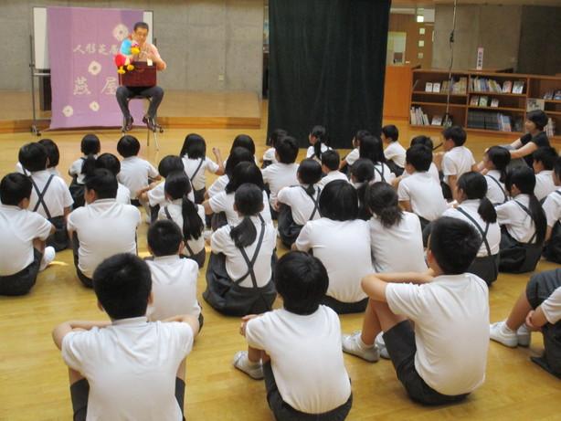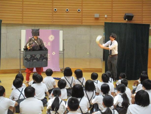 長野県の人形芝居{燕屋」さんに来ていただき、全校で人形劇をみました。腹話術でのカンクロー君とのやりとりがとてもおもしろく、会場は笑いでいっぱいになりました。「三枚のお札」の人形劇では、児童もお手伝いする場面があったり、先生の飛び入り参加もあったりと、とても盛り上がりました。楽しい人形劇を見せていただき、ありがとうございました。