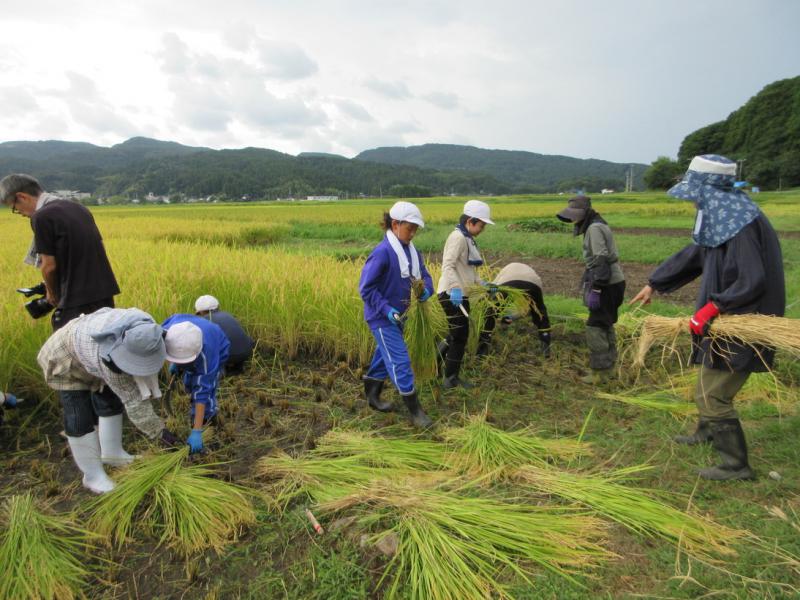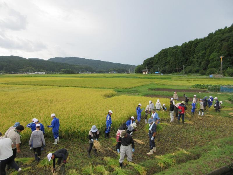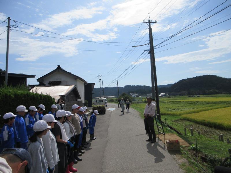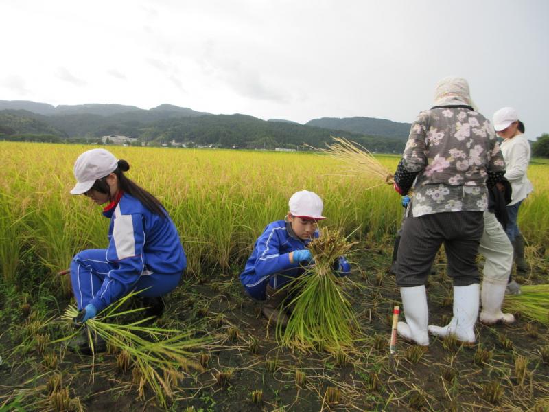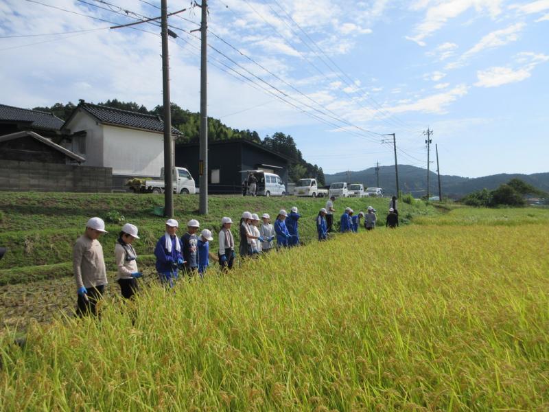 5・6年生が、稲刈り体験をしてきました。たかねをクラブのみなさんに、稲の刈り方や束ね方を教わりながら、真剣に作業していました。予定されていたはざかけ体験やコンバイン体験は、雨のため中止となってしまいましたが、よい体験ができました。