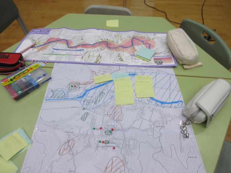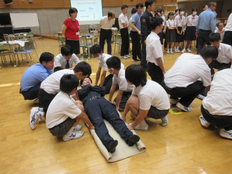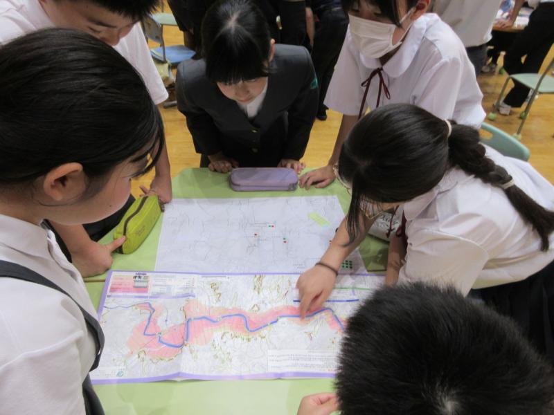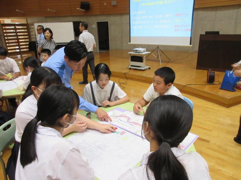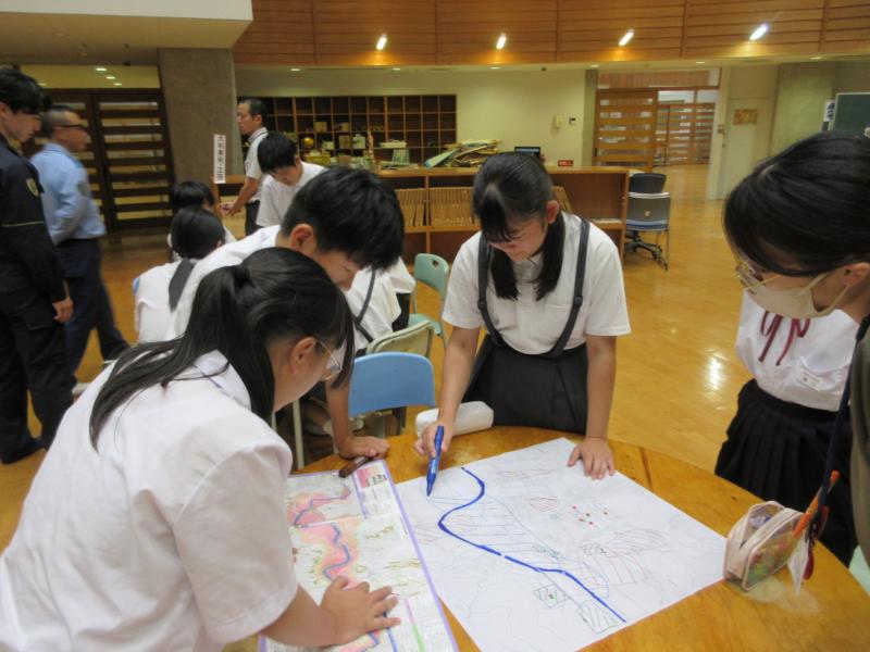 5・6年生が中学生と一緒に、輪島警察署員のみなさんに教えていただきながら、防災訓練を行いました。グループに分かれて図上訓練を行い、災害危険個所を知り、考えることができました。防災クイズで防災知識の向上を図り、身近な防災術では、簡易担架を作りみんなで体験しました。
