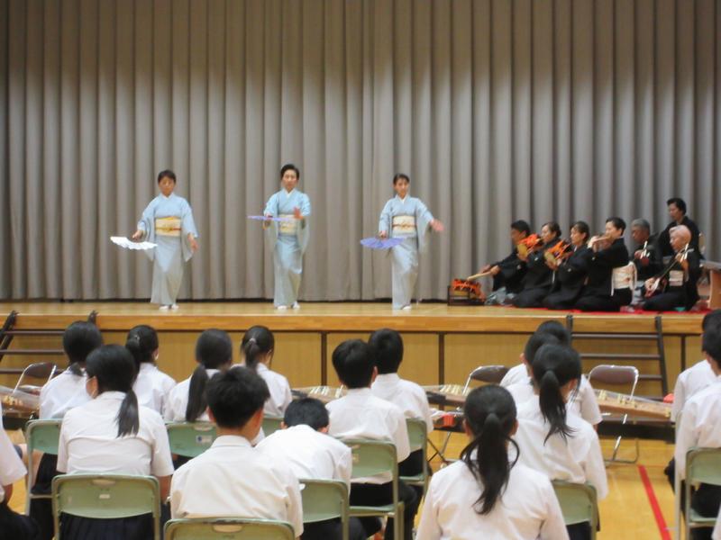 小中合同の古典芸能鑑賞教室がありました。日本舞踊を鑑賞したり、邦楽器の解説を聞いたりしました。箏、三味線、鼓、太鼓の和楽器や扇子を使った日本舞踊を体験させてもらいました。最後は「さくらさくら」を全員であわせました。普段接することの少ない邦楽や日本舞踊を鑑賞、体験することができ、よい体験となりました。ありがとうございました。