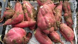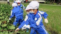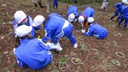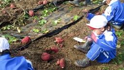 田下先生にお世話になり,1~3年生でさつまいも掘りの体験をしました。5月に植えた苗も大きく成長し,畑一面につるをのばしていました。まずはそのつるをとるところからスタート。これが大変でした。みんなで協力して引っぱって,運んで,気づけばみんなの身長よりも大きな山ができるほどの量でした。土が見えてきたところでようやく本題のいも掘りです。うっすら見えた紫色の頭を掘ってみると大量大量。掘れば掘るほどいもが出てきました。みんないも掘りに夢中で気づけば予定していた時間を大幅にオーバーしてしまいました。5限目に行われたいも掘りでしたが,みんな最後まで元気いっぱいでした。後日,天ぷらや焼き芋などにしてもらっておいしく食べたという感想も聞き,とてもいい体験になったと思います。(水岡)