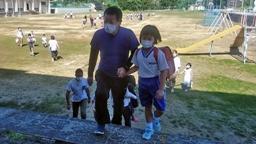 6:00起床。本来なら掃除が始まる時間ですが,コロナ対応で「しないで下さい」とのこと。7:00朝のつどい。パラパラと雨が降ったため,予定を変更して体育館で行いました。7:15朝の散歩。この頃には一旦雨は止んでいました。目的地は日本海クラブ。残念なことに,長い滑り台はコロナで使用禁止中でしたが,飛び石遊びやブランコで楽しみました。7:40に自然の家へ戻りましたが,到着直前に再びの雨。スマホで調べてあったので,ギリギリ難を逃れました。情報化時代ありがとう。