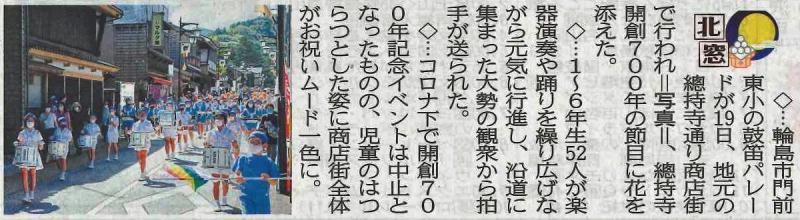 パレードは,予定通り10時に本校をスタート。途中,堀端にて立奏(10時10分~15分)し,一旦禅の里広場前にて演奏終了。しばらく細い小路を行進。学校が見えたところから再び演奏開始。10時30分に学校に戻りました。児童たちの演奏と踊りは上出来で,沿道で見守る方々を笑顔にしていました。児童の皆さん,よく頑張りましたね。この日は3連休の中日だったこともあり,(もちろん本校のパレードもあり,)翌20日の北國新聞朝刊では,総持寺通り協同組合代表理事の方が,「コロナ下で一番のにぎわいとなった」と語ったと紹介されていました。いつも地域の方々にお世話になりっぱなしの本校ではありますが,今回は,地域に大いに貢献できたのではないでしょうか。