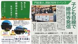 6年生が,総合的な学習の時間で總持寺について調べたことをパンフレットにまとめ,全12人分をラミネートしましたが,なんとそれを,禅の里交流館にて展示(左写真)してもらえることになりました。(広報わじま1月号でも紹介されました。)皆さんも是非一度禅の里交流館を訪問され,作品をご覧になって下さい。右写真は,その宣伝ポスター(交流館からいただいたもの)と,1月12日の北國新聞朝刊に載った記事です。なお,「曹洞宗大本山總持寺祖院」ホームページでは,6年生のパンフレット全12枚を紹介してくれています。是非アクセスしてご覧になって下さい。