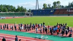 7:30集合。この頃は,昨日までの3日間の雨も上がり,雲は多めでしたが,天気予報通り晴れていました。まだ競技場は一部濡れていて,競技が進むにつれ乾いてくるのかなという状況です。今回の大会は,コロナ予防が徹底されており,応援の保護者の人数制限,健康チェック表の提出,マスク着用義務,競技場入り口での消毒等,万全でした。その一環として,メインスタンドではテントが張れず,開会式も児童代表1名,監督1名のみ,表彰式も行わないという徹底ぶりでした。
