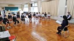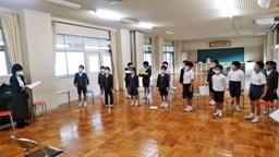 能登麦屋節を学習している3・4年生が,能登麦屋節を富山県五箇山に広めたと言われている「お小夜」の伝説を聞きました。読み聞かせてくださったのは,宮川三枝さん(鬼屋)。お小夜について書かれた小説「野菊の露-能登麦屋節考」を,ストーリーに合った特製BGMの流れる中,しっとりと読み聞かせてくださいました。悲しい運命をたどりながらも,美しい歌声で人々を癒やしたお小夜。彼女の悲しい気持ちが,児童の心にしっかりと響いたことでしょう。その後,能登麦屋節保存会会長井上孝雄さんの指導の下,久しぶりに能登麦屋節を歌いました。