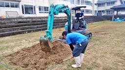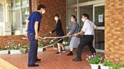 長休み,多くの児童たちが櫛比の森で遊んでいる中,若い男性が突然敷地外から櫛比の森に侵入し,「一緒に遊ぼう」と児童たちに声をかけました。その様子から,児童たちは不審者と断定。学校に逃げ込み(上段左写真),近くにいた先生方に知らせました。先生方のうちの一人は,その男性に対応し,もう一人の先生は職員室へ知らせました。校長は,近くにいた先生に児童を安全に避難させるよう指示し,別の先生に警察に連絡するよう指示。そして残った先生方と,刺股を手に現場(職員玄関)へ急行しました。そして,対応していた職員と入れ替わり,不審者の説得及び校舎内への侵入を防ぎつつ,警察官の到着を待ちました。