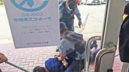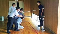 門前交番から広橋所長ら2名が到着し,あっという間に不審者を確保。さすがです。その後,児童達が避難している体育館にて防犯教室を行い,輪島警察署生活安全刑事課生活安全係長である大西さんに,いろいろ教えていただきました。児童たちが教室に戻った後,授業者以外の職員が,刺股の使い方について大西さんに教えていただきました。不審者役の塩谷さん(昨年度,皆月駐在所に勤務されていました)には,もう一度不審者役をお願いしました。お世話になった4名の皆さん,ありがとうございました。