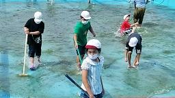 曇天の下,プール開きを行いました。とにかくこの時期のプール開きとしては,プールでできただけでも大満足です。はじめにお話をした後,プールの四隅に塩をまきました(左写真)。その後,プール使用の諸注意をしっかり聞いた後,念願のプールに入りました。児童たちは,常に3密に気をつけていましたが,泳いでいれば人と人が近づいてしまうこともあります。そんな時は,先生方がプールサイドから教えてあげていました。来週から本格的にプールが始まります。楽しみですね。