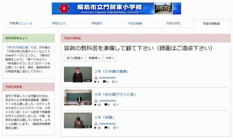 本日より,学習支援動画ページを臨時休校中の期間限定で公開いたします。(今回は算数です。)ページ右上の「ログイン」をクリックし,本日保護者の皆様方に「連絡メール」にてお送りしたログインIDとパスワードを打ち込んでいただければ,このページを観ることができます。まだ公開は3学年分だけですが,準備でき次第順次アップし,5月1日までに全学年・全学級分を公開いたします。保護者の皆様方におかれましては,このページを公開する趣旨をご理解いただき,児童の家庭学習に生かして下さいますようお願いいたします。(なお,この動画を何らかの方法で保存することはご遠慮下さい。)