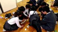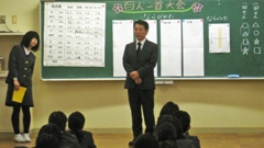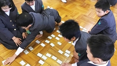 最後に,児童たちの頑張りを褒めた後,百人一首について,児童の興味を喚起する話をしました。「100枚のうち一番多いのが恋に関する首で43首。三番目に多いのは旅に関する首で4首。二番目に多いのは33枚ですが何の首でしょうか?」児童たち,少し考えた後,次々に「季節」とか「四季」とか言ってくれました。「そうです。四季に関する首です。では,一番多い季節は?」これも簡単。「秋!」児童たちの意見は一致。正解でした。春は6首,夏は4首,秋は17首,冬は6首。ダントツですね。分かるような気がします。「ただ闇雲に多くの首を暗記するのではなく,その首の意味や良さを感じ取り,好きな首(札)も作りながら楽しく覚えて欲しい。」そう伝えました。来年も楽しみです。