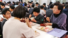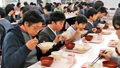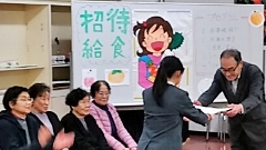 1月24日(金)~30日(木)は学校給食週間。初日のこの日は,学校給食に野菜(馬鈴薯,玉葱,大根,葱,白菜,菠薐草等)を納入してくださっている栃木地区の方々をお招きし,「招待給食」を行いました。(この日の給食には,葱を使いました。)お招きしたのは,(写真左から)山みい子さん,澤田 茂さん,源 恵美さん,山崎真理子さん,山下あさ子さん,下浦國子さん,林 好子さんの7名です。