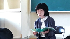 能登麦屋節が有名になるきっかけとなった門前の女性「お小夜」。この日は,宮川三枝さん(鬼屋)に,そのお小夜について書かれた小説「野菊の露-能登麦屋節考」を読み聞かせていただきました。悲しい運命をたどりながらも,美しい歌声で人々を癒やしたお小夜の物語を,みんな真剣に聴いていました。その後,能登麦屋節保存会会長井上孝雄さんの指導の下,久しぶりに能登麦屋節を歌いました。