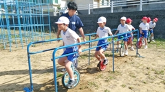 秋らしい日々がやっと訪れました。児童たちは,一輪車に夢中です。一輪車は,低学年のうちに頑張れば,比較的多くの児童が上手に乗れるようになります。しかし,だんだん体が大きくなるにつれて,上手になるのが難しくなってきます。(大人になってからはじめると,さらに難易度が上がります。)1・2年生には,できるだけ早く上手になってもらいたいです。この日,2年生は,体育の授業の一部を使って練習していました。また,長休みでは,1~4年生が競って練習していました。みんな,めきめきと上手になってきました。