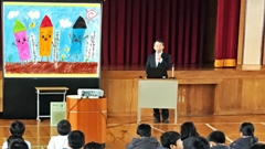 次に,昨年度に引き続き,読書の楽しさを伝えるプレゼンテーションを行いました。今回「読み聞かせ」たのは,「つりばしわたれ」と「なかよしくれよん」です。「つりばしわたれ」は長崎源之助さんの作品で,以前は長い間3年生の国語の教科書にも載っていました。その頃は挿絵としてイラストが入っていましたが,今回読み聞かせたのは絵本。鈴木義治さんの素敵な絵が児童たちを本の世界に誘いました。「なかよしくれよん」は(少し前の)輪島の小学5年生が作った絵本。読むばかりでなく,「自分も物語を書いたみたいな。自分だったらこんなストーリーにするな。」等,いろいろな気持ちを持って読書すれば,もっともっと読書が楽しくなると思います。