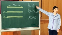 2年は,番場誠さん。七浦公民館の館長さんとして,通学合宿などで,学校の教育活動を側面から支援して下さっています。この日は,七浦地区に伝わる能登麦屋節についてお話していただきました。