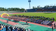 西部緑地公園陸上競技場にて,県駅伝が行われ,本校も出場しました。本校の選手たちは,これまで1ヶ月間練習を重ねてきました。その成果を発揮し,全員無事走りきりました。一人1.5kmと,駅伝としては比較的短距離なのですが,その分集団のペースが速く,第1区のスタートは,さながら100m走のスタートのようでした。