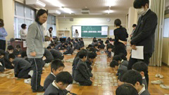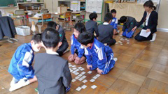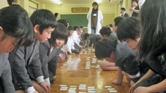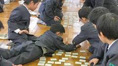 百人一首大会を行いました。集会室は熱気にあふれ,上の句が歌われ始めるとすぐに,カードをたたく「パシッ!」という音が,あちこちからあがっていました。上の句を聞けば下の句が分かる児童は多く,あまり覚えていない児童は,あっという間にカードがなくなるのを見ているだけという状態。この大会の面白いところは,低学年も高学年も実力にほとんど差がないことにもあります。1年生や2年生にも,冬休みの間に得意札を大きく増やしてきた児童が何人もいて,彼らの獲得カード枚数は圧倒的でした。百人一首は,たくさんのことを一生懸命暗記することで,脳の活性化にも効果があると思います。また,知らず知らずのうちに,歴史・古典の知識が蓄えられます。是非,来年もこの大会を行いたいと思います。ちなみに,この日優勝したチームは,前日の縄跳び集会で最下位だったチーム。よかったですね。