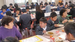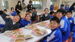 1月24日(木)~30日(水)は学校給食週間。本校では,学校給食に野菜(馬鈴薯,玉葱,大根,葱,白菜,菠薐草等)を納入してくださっている栃木地区の方々をお招きし,「招待給食」を行いました。お招きしたのは,(写真左から)荒木八重子さん,澤田茂さん,下浦國子さん,登間佐久子さん,林好子さん,山下あさ子さん,源恵美さん,山みい子さん,山崎真理子さんの9名です。感謝状をお渡した後,会食。いつもはおしゃべりせずに食べる給食ですが,この日はおしゃべり解禁。児童たち,お招きした方々と楽しく会話しながらおいしい給食をいただきました。お招きした方々は,「楽しかった。」「若さを吸い取った。」などと喜ばれていました。現在は種を植えて育てている状況なのだとか。また野菜が大きくなったら,おいしくいただきたいと考えています。今後も,よろしくお願いいたします。