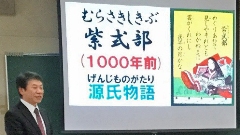 寒い日ではありましたが,4階集会室で行ったので,児童・職員一同快適でした。全校集会の前にはいつも表彰を行っています。今月は,書き初め関係の表彰が多く,賞状だけでなく大きな盾を複数の団体からいただいた児童に対し,尊敬と羨望のどよめきが起こりました。集会では,校歌,児童委員会の発表の後,6年生の学年発表がありました。宮沢賢治の「やまなし」の朗読と「風を切って」の演奏でした。1~5年の児童たち,いつも以上に真剣な表情で見つめていました。さすが6年生。最後に私は,前日の百人一首大会で児童たちがすごく頑張って札を覚えてきていたことに感動し,ただ記号として暗記している児童たちに百人一首の魅力を伝えたいという思いにかられ,「百人一首って?」という表題のプレゼンテーションを作成し,披露しました。100人の歌人から5人を選び,エピソードとともに,彼らと,その和歌の魅力を伝えました。児童たち,嬉しそうに反応しながら見入ってくれました。また,5名の紹介の中で,その和歌の最初の5文字を教え,その続きを読み上げさせたのですが,どれも大人数の大合唱となり,かなりの児童が相当数の和歌を暗記しているのだと改めて確認できました。すばらしい。