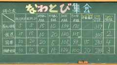 縦割り班(美化・体育委員会,放送委員会,図書委員会,保健・給食委員会)対抗による縄跳び集会を行いました。(1~3年生も,委員会での仕事はありませんが,縦割り班活動のために,どこかの委員会に入っています。)種目は,①持久跳び(低学年2分,高学年3分),②技跳び(あや跳び,後ろあや跳び,交差跳び,後ろ交差跳び,二重跳び)30秒,③駆け足跳びリレー(A・B班),④8の字跳び3分(A・B班),⑤すごい技(隼跳び,三重跳び,後ろ二重跳び等)披露(得点には含まない)。その他,行儀・協力も採点(2位まで)しました。得点表を見ていただければ分かりますが,8の字跳びの得点比率が圧倒的に大きいです。8の字跳びは,「スポチャレいしかわ」の種目でもあり,これまでずっと「体力アップタイム」などで練習してきました。まだまだこれからも頑張ってほしいと思います。