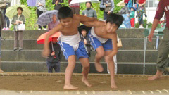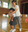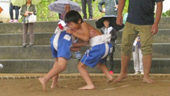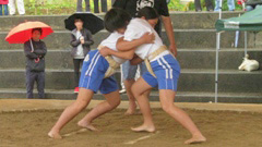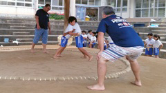 左写真は,前日の最後の練習の様子です。組み合っている児童を指導しているお二人は,それぞれのお父さん。力が入る児童2人でした。