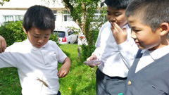 秋の昆虫の季節です。今,くしひの森では,栗や木の実が落ちていたり,カマキリやバッタ,コオロギなどがいっぱいいて,休み時間は,子どもたちの歓声で賑わっています。すばらしい環境です。2年生は,教室でカマキリ(中央写真)を飼っています。餌としてバッタやコオロギを捕まえて,カマキリのカゴに入れていました。卵を産むまで育てられるといいですね。