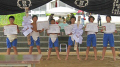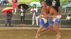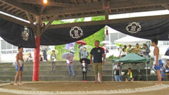 保護者の皆様には,雨中の応援をお願いすることになり,本当に申し訳ありませんでした。そして,大会終了後,雨でぐちょぐちょの運動場でテントの片付けを手伝ってくださった保護者の皆様,誠にありがとうございました。児童はというと,相撲場で行えたことを,とても喜んでいたそうです。(特に最後となる6年生。)