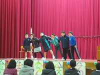 「柿山伏」の狂言を披露し、見ていた児童から「おもしろかった。」という声がたくさんありました。