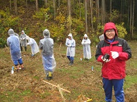午前中は門前町鍛冶屋地内で広葉樹植栽をしました。雨が降っていましたが,子どもたちは大きく育つように祈りながら植樹しました。