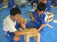 午後からは清水にある門前林業センターで椅子作りをしました。作り方を教えてもらうと,友だちと協力しながら椅子を作ることができました。作り終えた後は,うれしそうに椅子に座って他の小学校の友だちともお話をしたり遊んだりしていました。