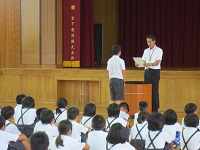 9月1日、2学期のスタートです。夏季休業中、大きな怪我や事故もなく、今日も全員元気に登校しました。始業式では3つのことを話しました。次の3つです。①学びを生活に生かすこと ②「聴く(『聞く』ではなく)ことを大切にすること ③一生懸命頑張る姿を見せてほしいこと