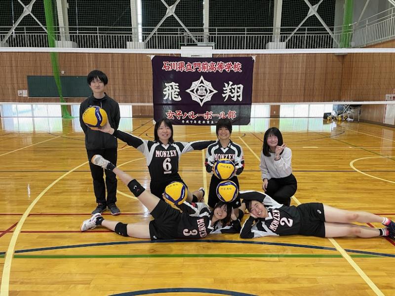 私たち女子バレーボール部は、3年生2名、2年生1名、1年生1名の計4名で現在活動しています。人数が少ないですが、他校と合同練習を行うなど、工夫して様々な練習に取り組んでいます。今年度は松任高校さんと合同で6月の県総体にも出場しました。