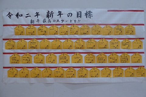 新年の目標を書き込んだ絵馬をランチルーム横の廊下に掲示しました。