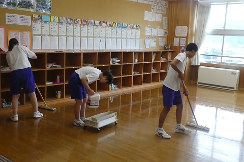 普段している無言清掃のあと,全校生徒で大掃除を行いました。
