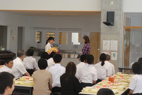 給食の時間にALTのシンシアさんのお別れ会がありました。