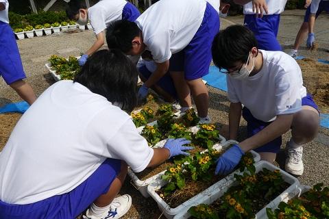 1年生は,總持寺周辺の町に並べるプランターづくりをしました。
