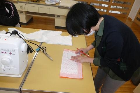 家庭科の第1時間目はマスク作りをするので、まずは職員で練習してみます。