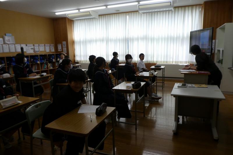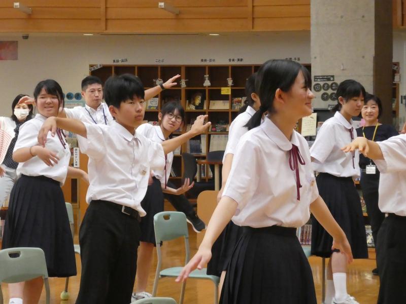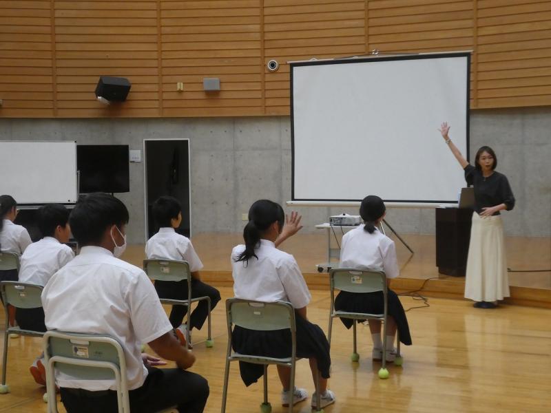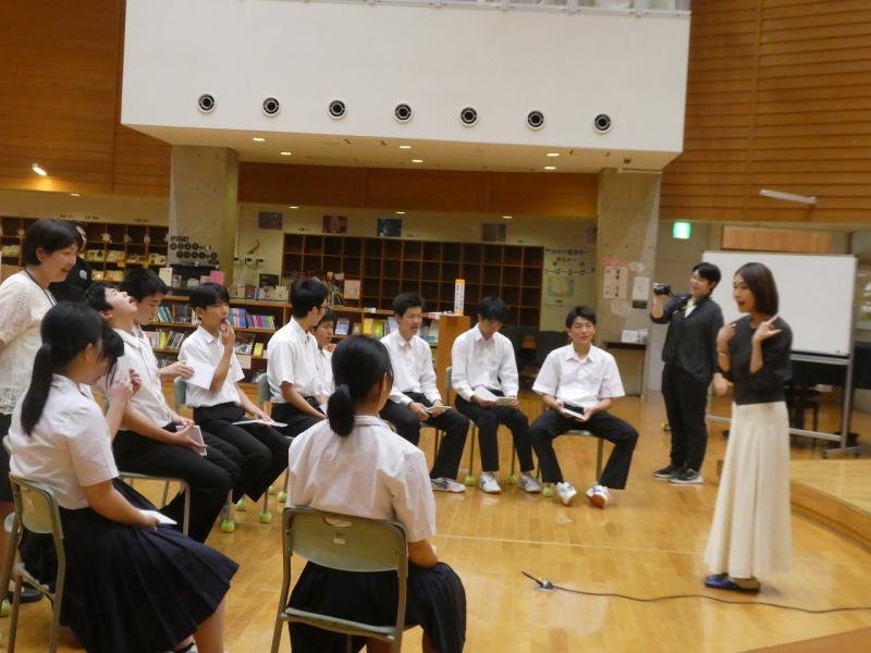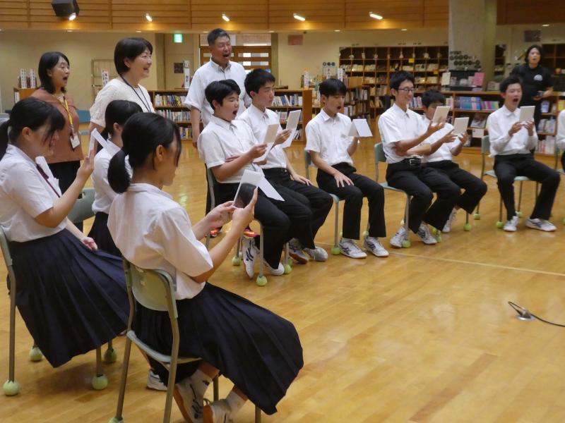 早口言葉の練習では、山田さんから「失敗しても、最後まで言い切ることが大切」と励まされ、生徒たちはリズムに合わせて最後まで言い切ることができていました。まだ声が小さく、恥ずかしそうな様子も見受けられましたが、一所懸命に取り組んでいました。