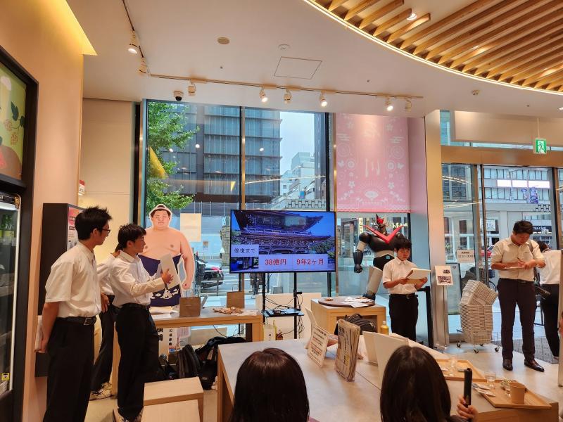 生徒たちは、總持寺通り商店街の歴史を学んだ後、仮設店舗で商店街を営んでいる事業主の方々から貴重なお話を伺いました。お話の中では、地震後の店舗の様子やその時の思い、そして、店舗を再開しようと思った理由など、様々なお話をしていただきました。