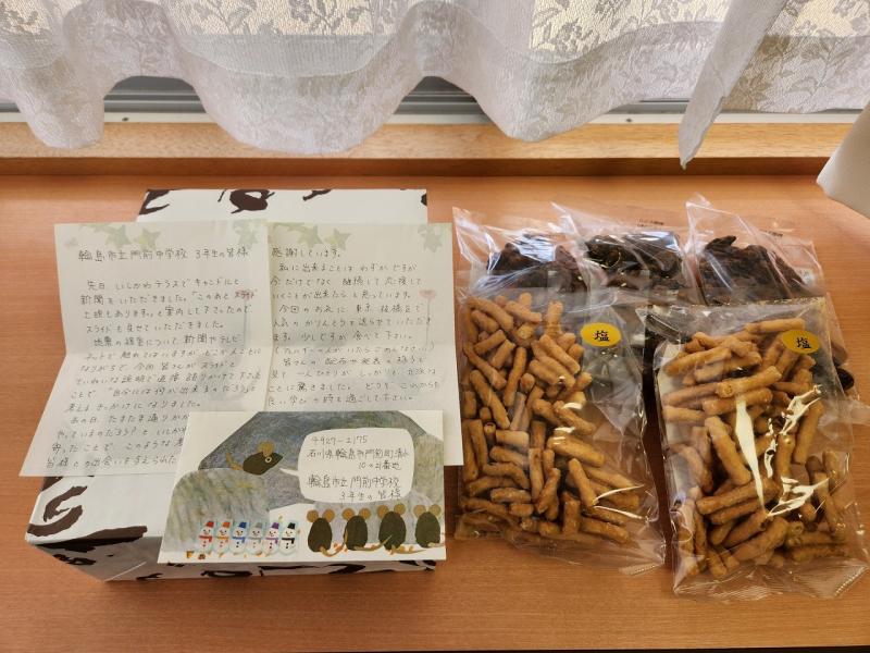 先日、修学旅行でのPR活動を聞いてくださった東京在住の方から、3年生に向けてお礼のお手紙とかりんとうが届きました。