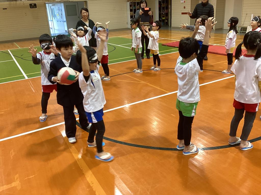 アイマスクをしてのボール送りゲームは、音を頼りにボールを受け渡す体験になりました。