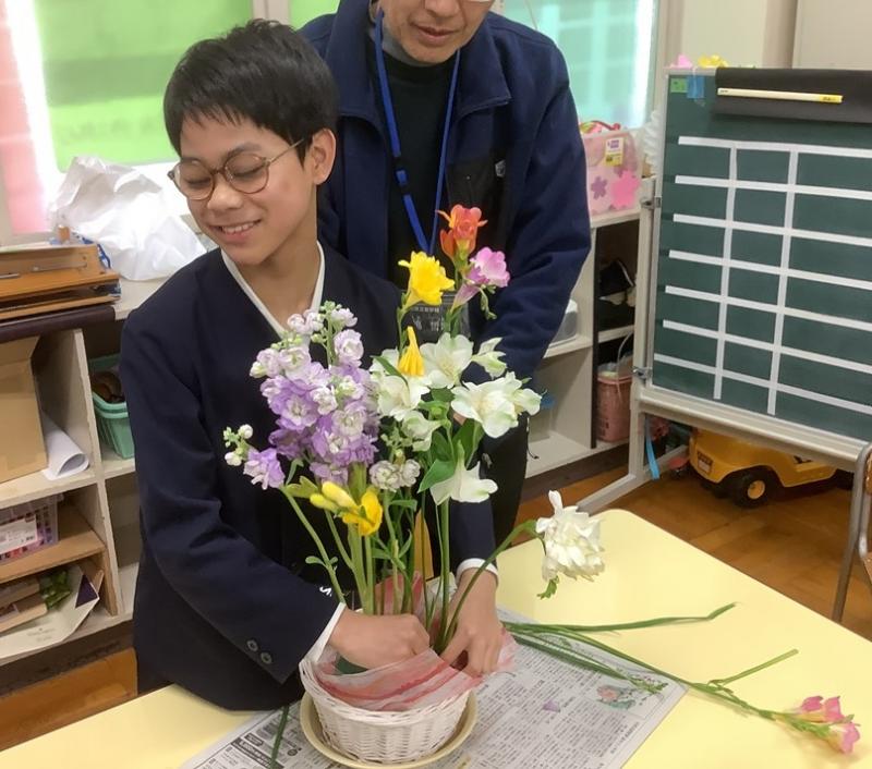 2024年3月4日 13時32分2月27日に、「おはなばたけ」さんというお花屋さんからいただいた花をつかって、フラワーアレンジメントに挑戦してみました。色とりどりの花を触ったり、においを嗅いだりと、楽しみながら花を生けました。花の長さや、刺す場所を考えながら、それぞれ工夫して生けることができ、素敵なアレンジメントが完成しました。「おはなばたけ」さん、いつもお花をありがとうございます。