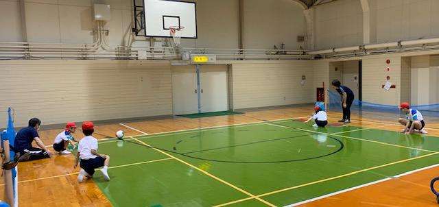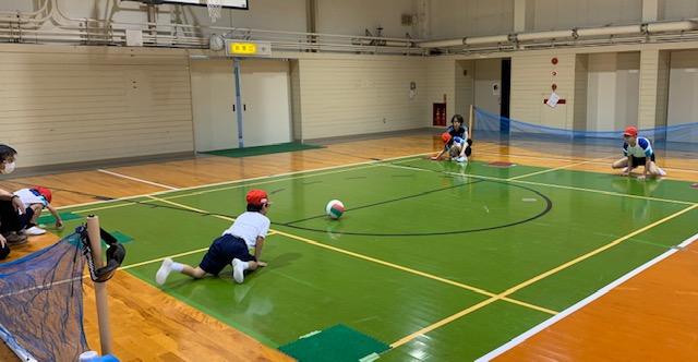2020年7月14日 10時14分体育では、ゴールボールをしています。友達やアイマスクをした先生と対戦しています。