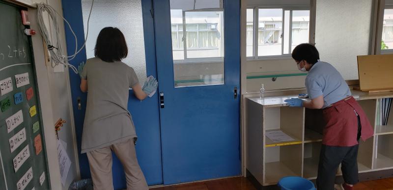 2020年6月25日 10時58分育友会の方々が奉仕活動の一環で、校内の消毒活動を開始しました。本校は保護者と職員が一丸となって、感染予防に努めています。