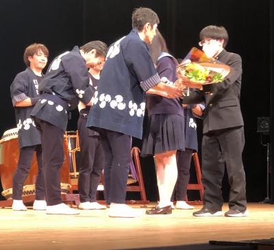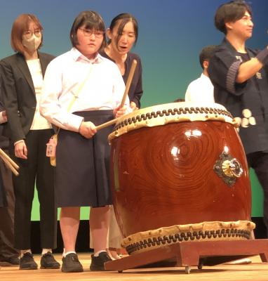 会場に響き渡る太鼓の音と振動に参加した生徒、教員共に感動しました。体験会では北陸学院高校の生徒と一緒にリズムに合わせて太鼓の演奏を行いました。演奏後、北陸学院高校生徒会長と盲学校生徒会長が感謝の言葉と共に花束を贈呈しました。