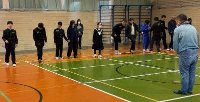 呼吸法や発声法では母音の口形を学び、マ行で口を閉じる動きが必要なこと、ハ行は息を大きく出す必要があることを学びました。参加した生徒全員は普段意識することのなかった口形の違いに驚き、楽しみながら各行の声を出しました。