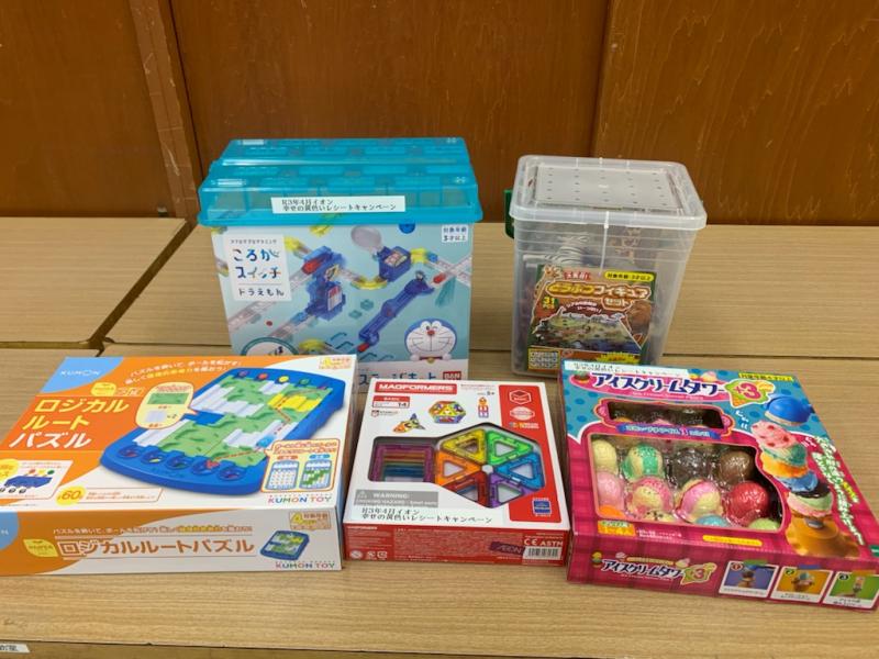 マグネットのブロックやプログラミングのおもちゃななど計5点。幅広い年齢層の子どもたちが楽しめるものです。乳幼児の相談室や児童生徒に有効に活用させていただきます。